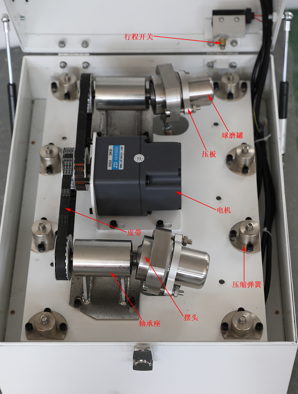 1.壓縮彈簧 2.電機 3.軸承座 4.球磨罐 5.壓板