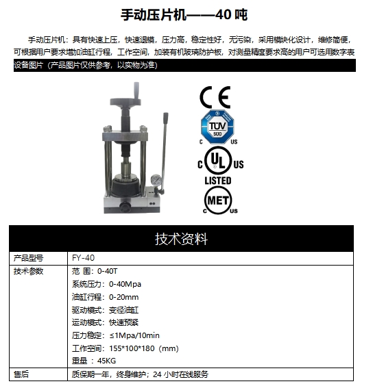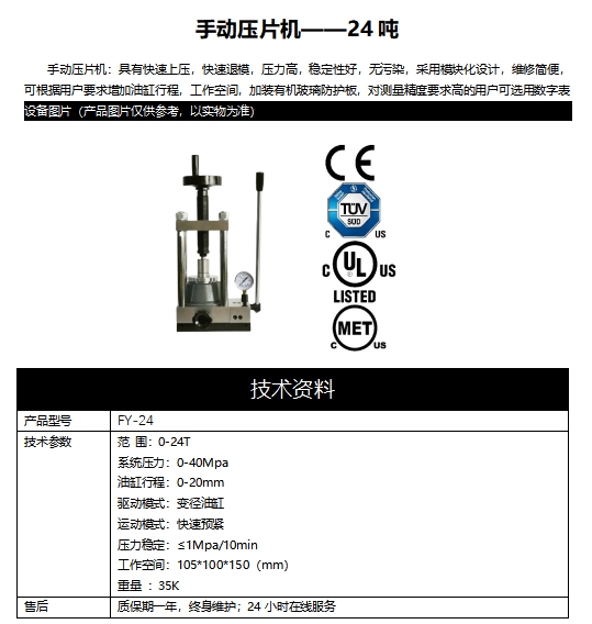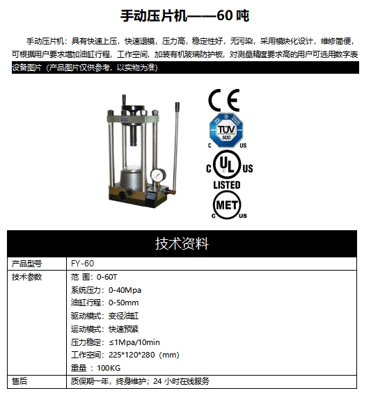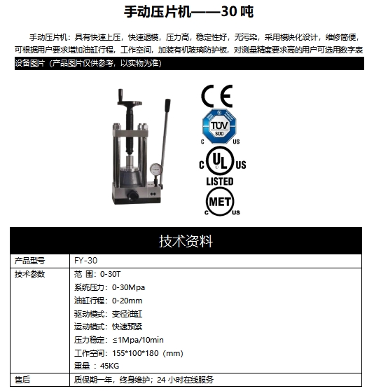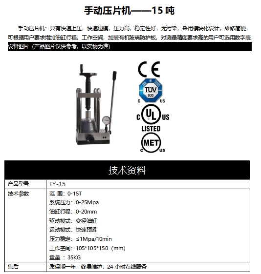 劉經(jīng)理:152-5621-8430(微信同步)手動(dòng)壓片機(jī):具有快速上壓,快速退模,壓力高,穩(wěn)定性好,無(wú)污染,采用模塊化設(shè)計(jì),維修簡(jiǎn)便,可根據(jù)用戶要求增加油缸行程,工作空間,加裝有機(jī)玻璃防護(hù)板,對(duì)測(cè)量精度要求高的用戶可選用數(shù)字表